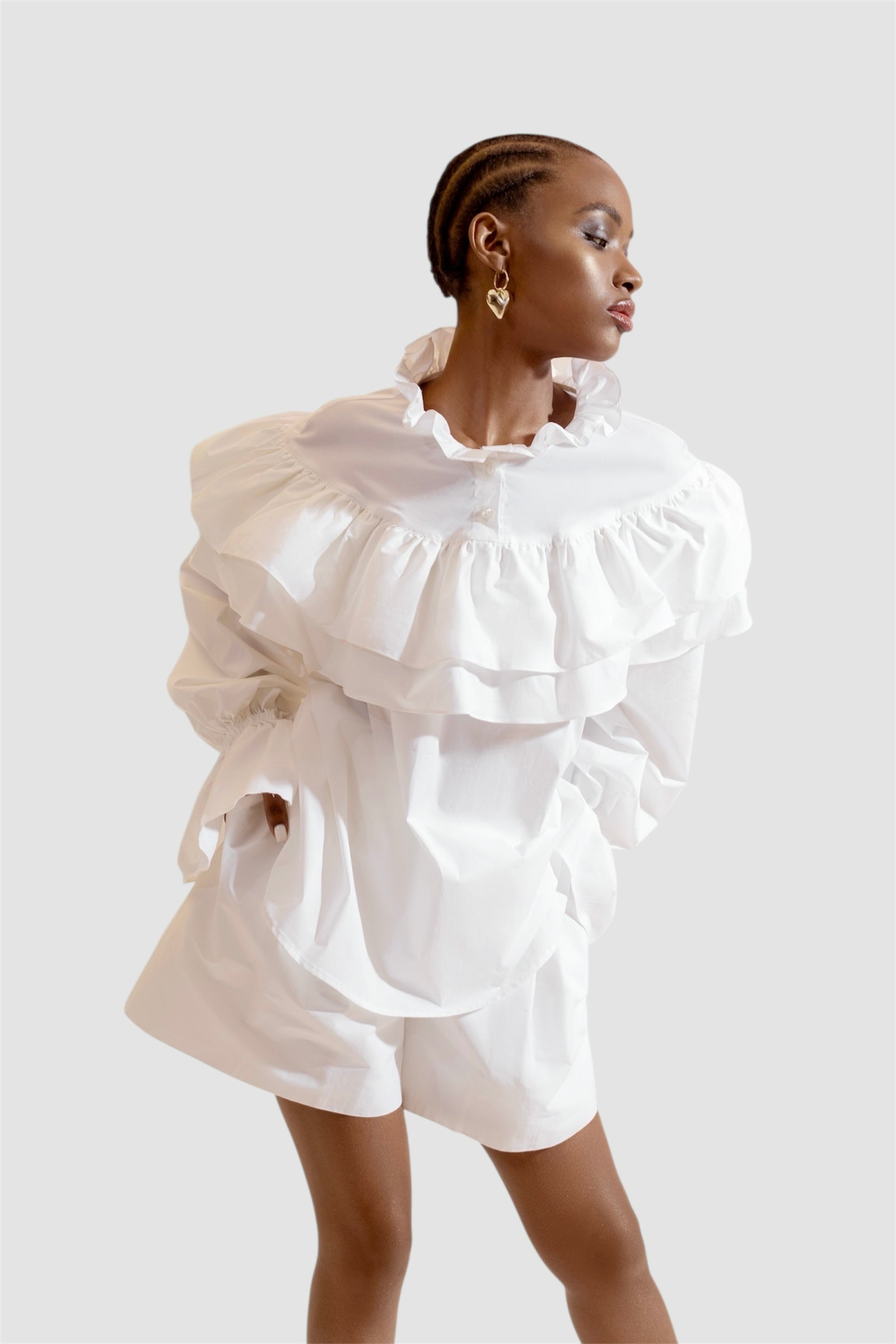 The Charlotte Blouse with cascading ruffles is airy, delicate, and romantic. Perfect for adding a touch of femininity to your wardrobe, this blouse effortlessly combines style and comfort.